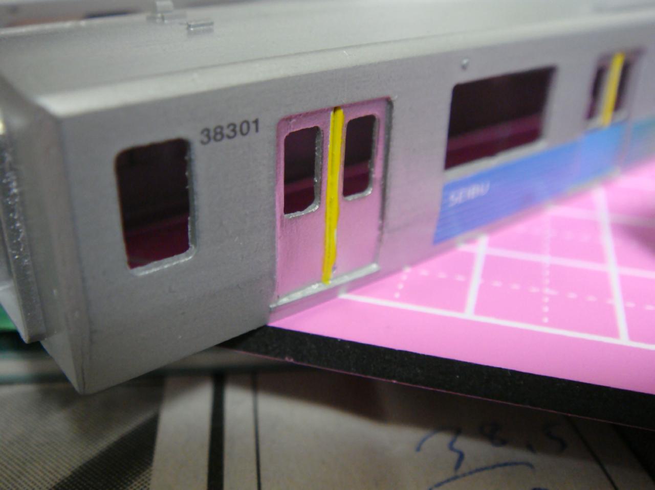 いろいろ細かいところを修正しましたがすべては修正し切れませんでした。。。角のエッジがきれいに出ていたのと戸袋が若干見栄えが悪くなってしまいましたが1200のサフでごまかしました(今回はキレイに吹きました)。あとは戸先の警戒色のベースにするホワイトを薄く丁寧に塗った後、マスキングテープを細く切り出してマスキングします。