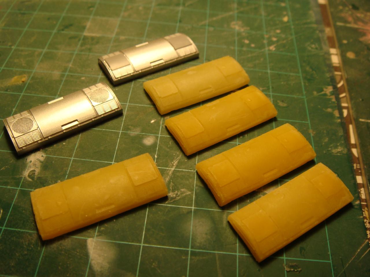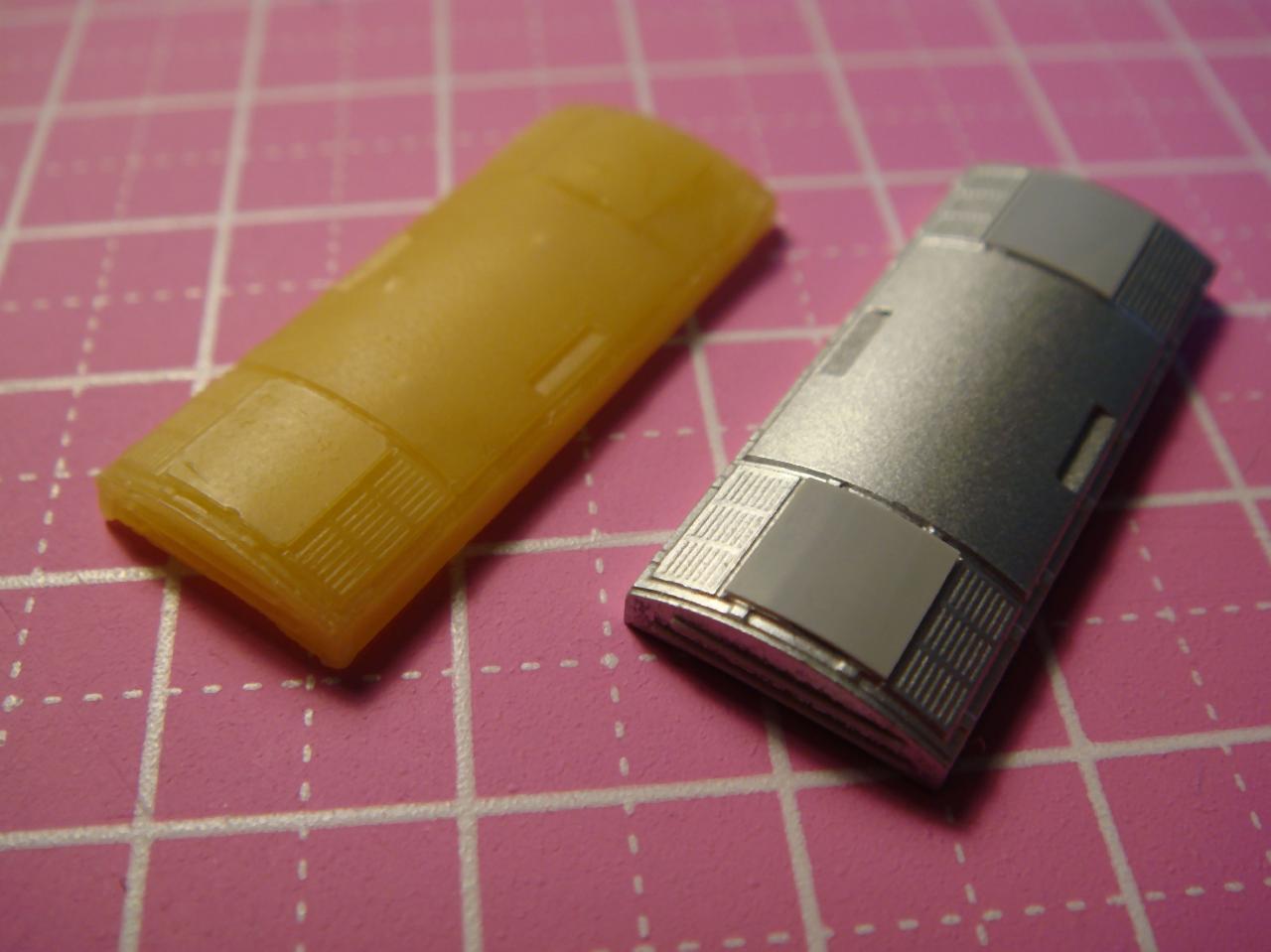 話がそれてしまいましたが、今回は京王8000のクーラーを使います。・・・・高い・・し、あまり在庫がないのでふたたべおゆまるくんの出番です。京王8000のクーラーに対して西武30000系はメッシュが四角いのと側面にビードがついているのでその加工をしました。メッシュ部分はあとでデカールで表現する予定です、たくさんコピーしちゃいましたが、バリとり含めて1個5分くらいできました^^