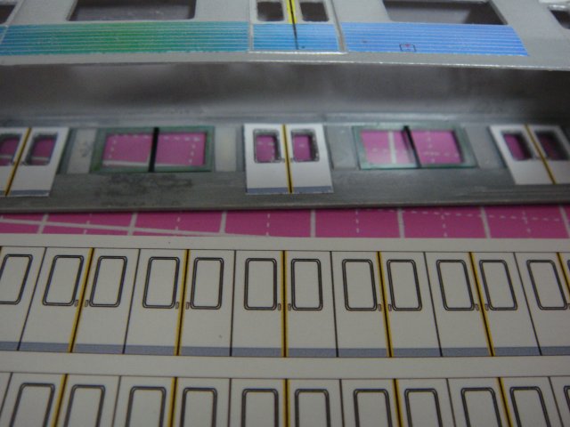 戸先をマスキングした後スーパーファインシルバーを塗り、ドアの部分が若干ですがヘアラインが無く質感が違う気がしたので、ドア部はスーパーファインシルバーにするということでマスキングします。逆西武2000系みたいな感じになりました^^