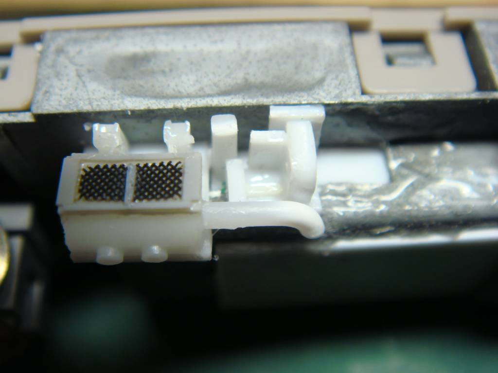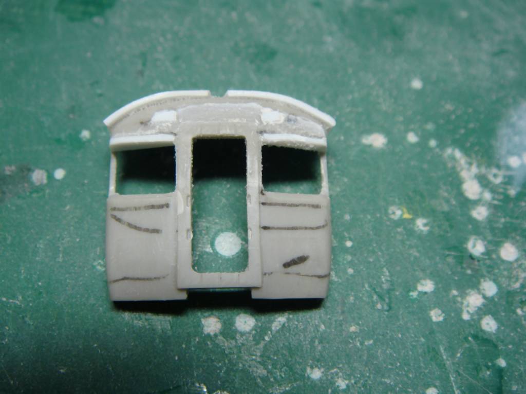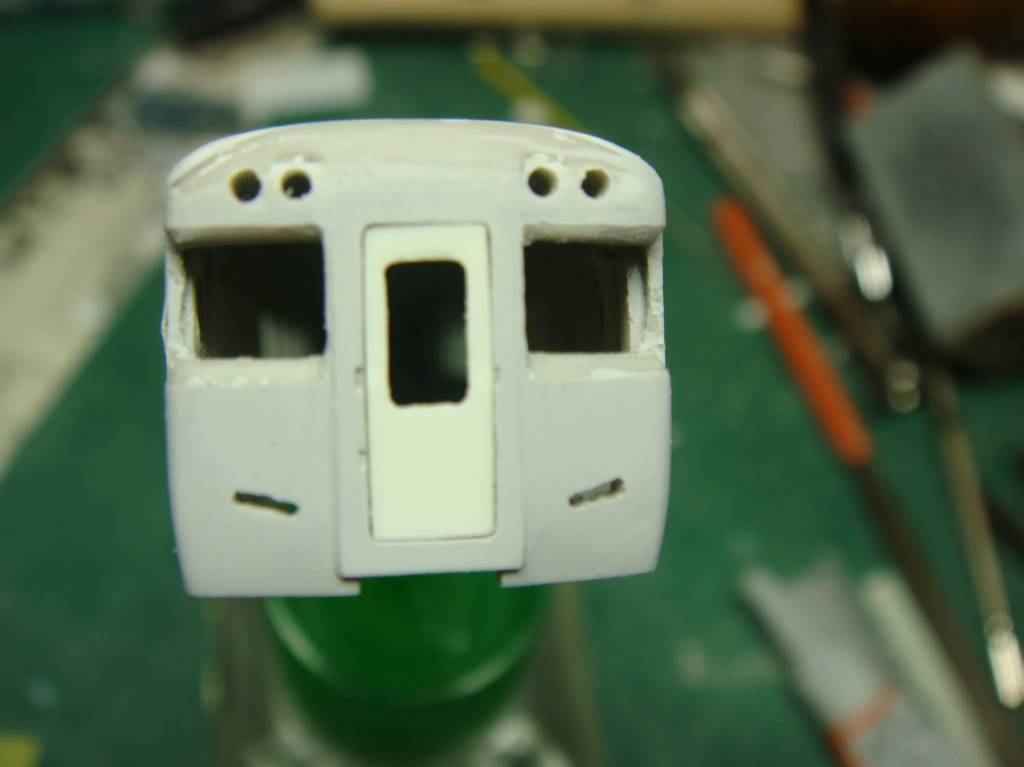 いきなり飛びますが、オデコのRを削ってライト穴をあけて窓の周囲に奥まっている角度をツケます。貫通路はプラシートで別パーツとします。