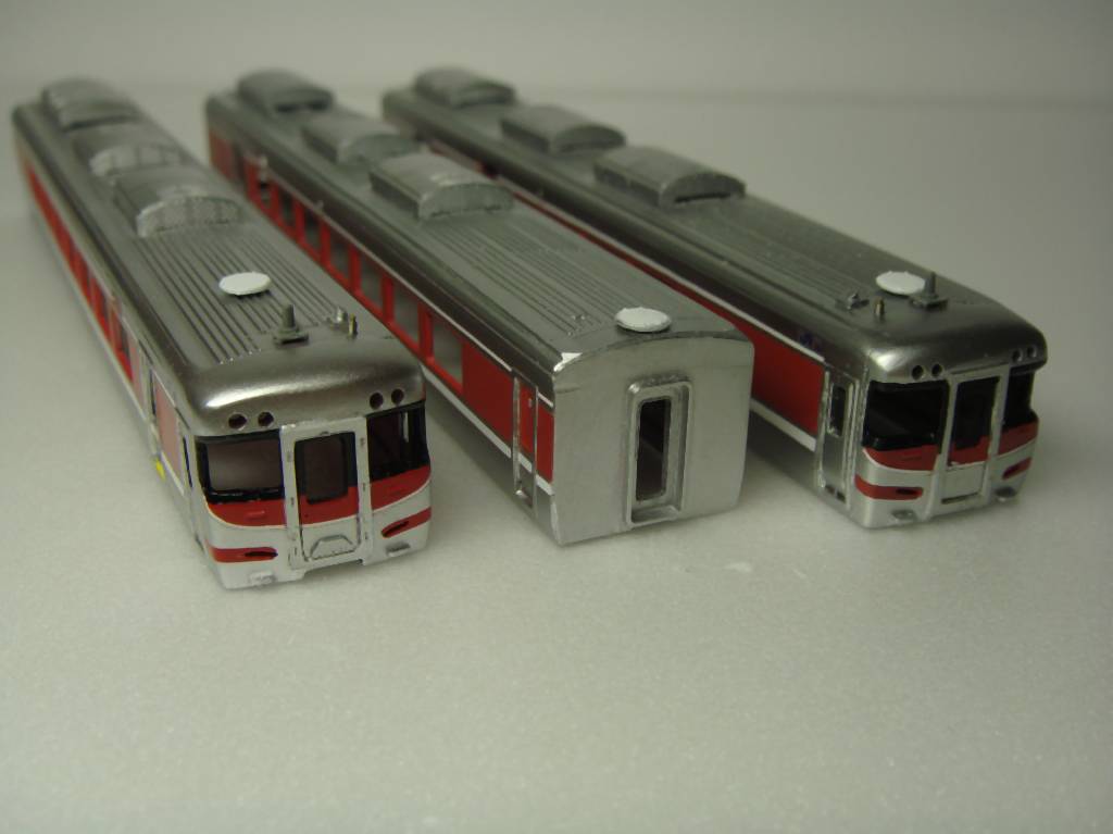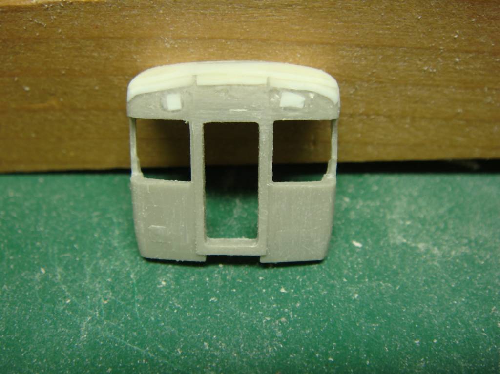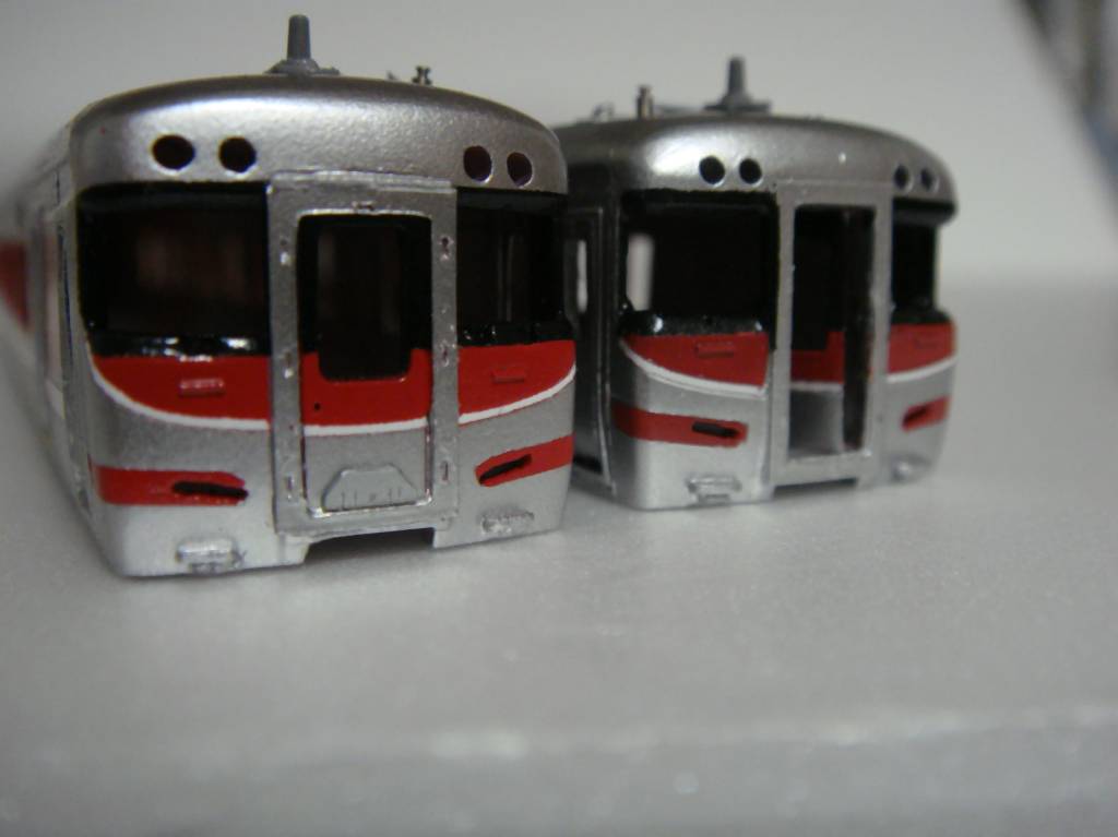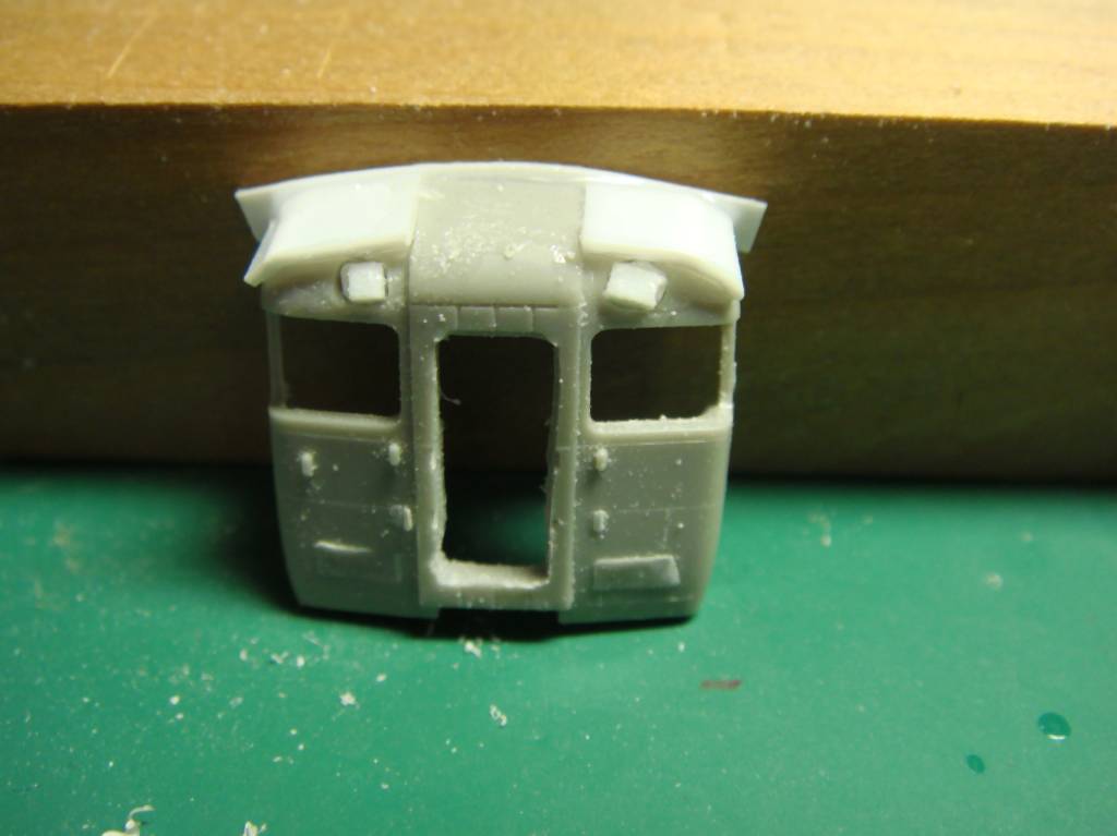 塗装して確認しましたが、塗り分けでもちょっとごまかせないような出来でしたので、一両目はホロをつける車とします。もう片方の先頭車は反省点を生かしてオデコの作り方を変えます。肩のRを小さくする感じで近鉄臭を消します。