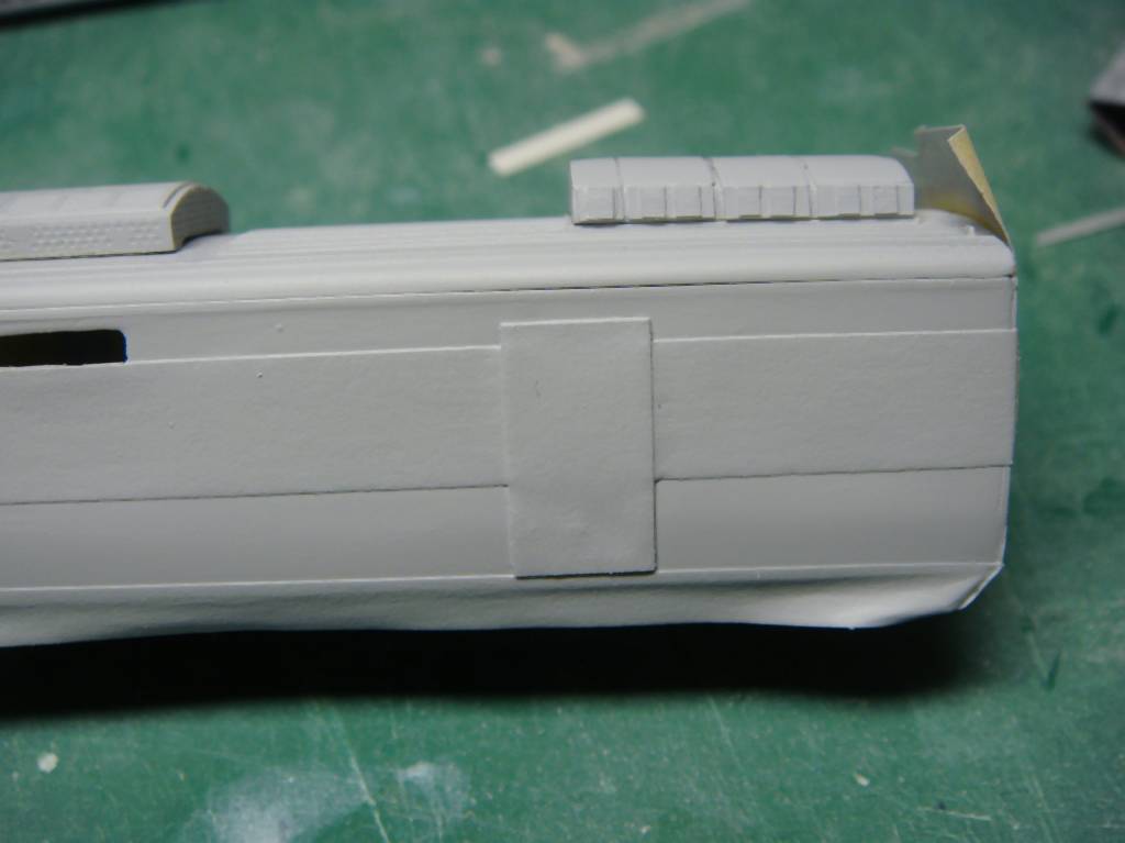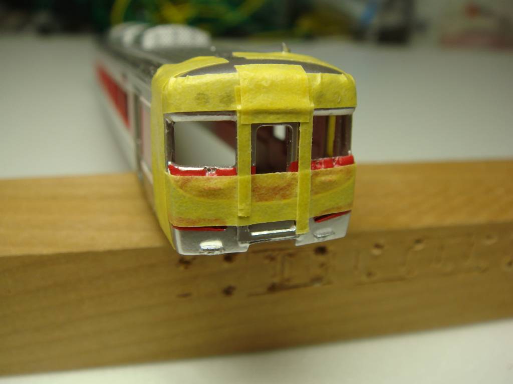 ステンレス車外板の継ぎ目を表現するためにマスキングしてサフを吹きます。