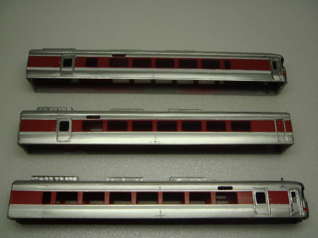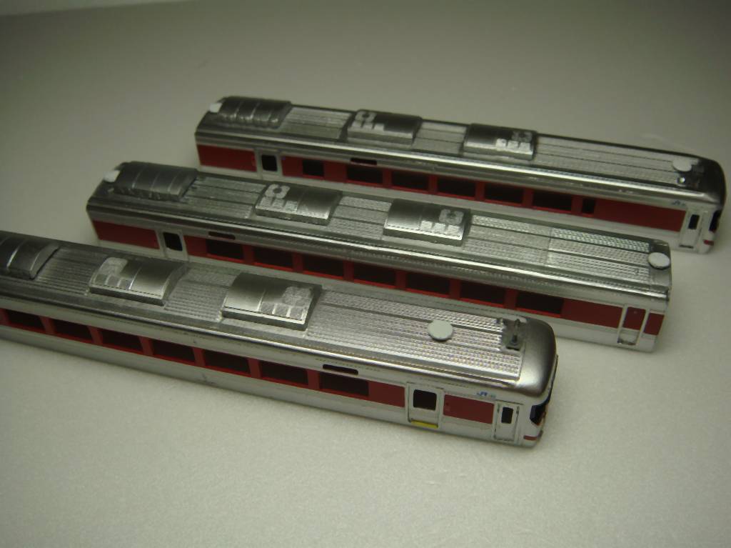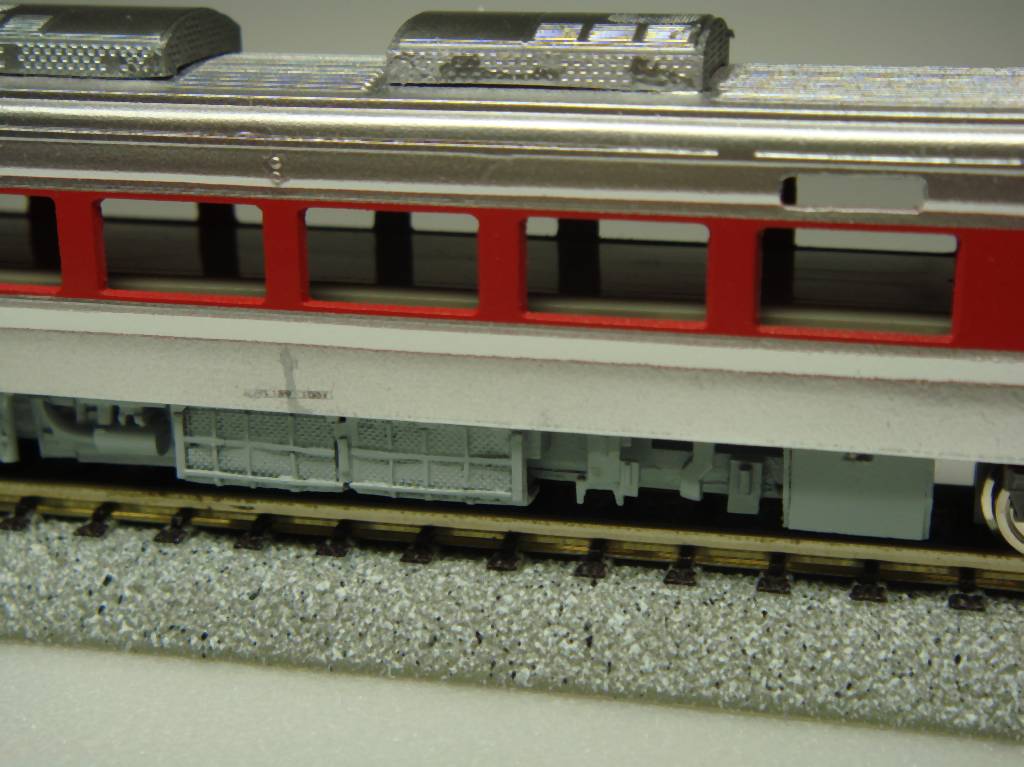 まずまずの出来です。今回はキハ187の表現を真似しましたが、ごちゃごちゃした床下をうまく丸めてるメーカの表現はさすがだなぁと思いました。車体中央部の機器箱は手で作ったのでちょっと不揃いでしたので、他の2両はロボットによる製作に変更しています。