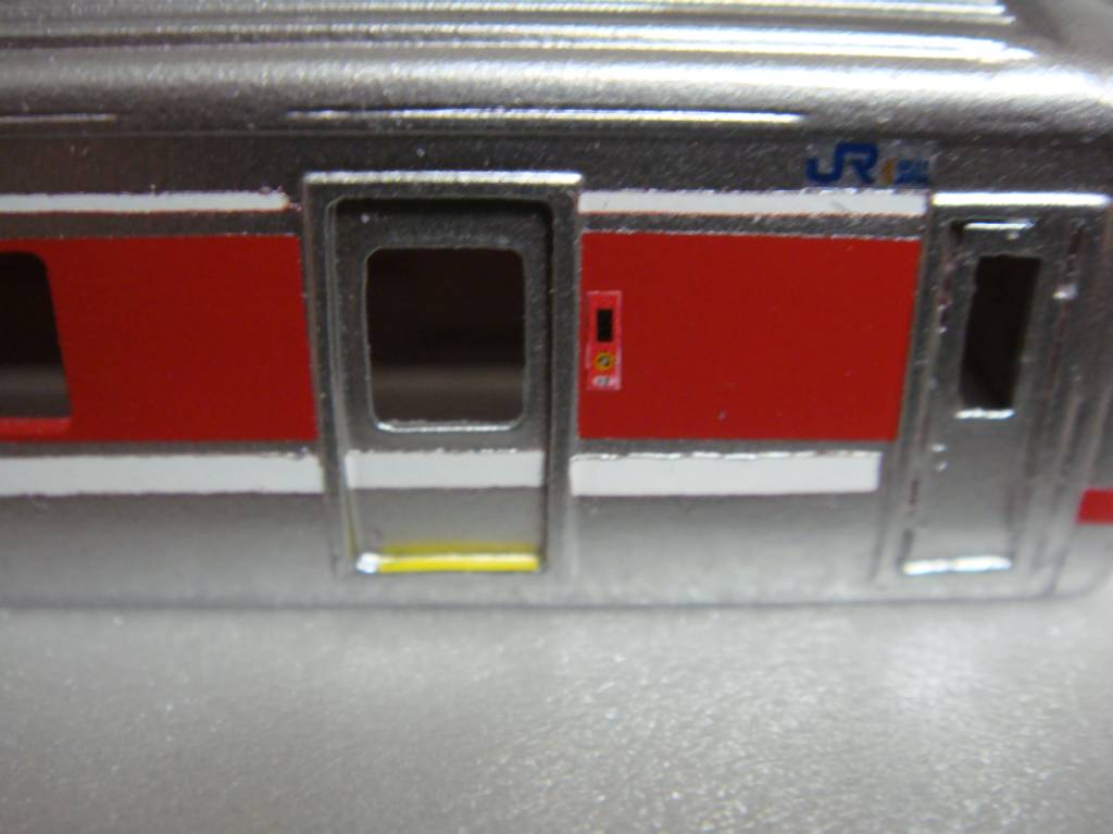 まずまずの出来です。ちょっと雨樋の処理を失敗したか。。。JRマークは下地がシルバーだとちょっと透けてしまいますね。ドアのステップには黄色いシールを貼っておきました。結構効果あるかも。