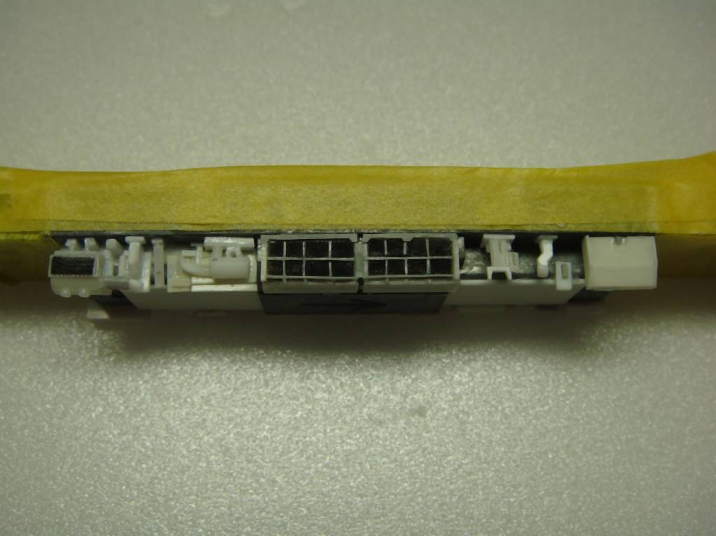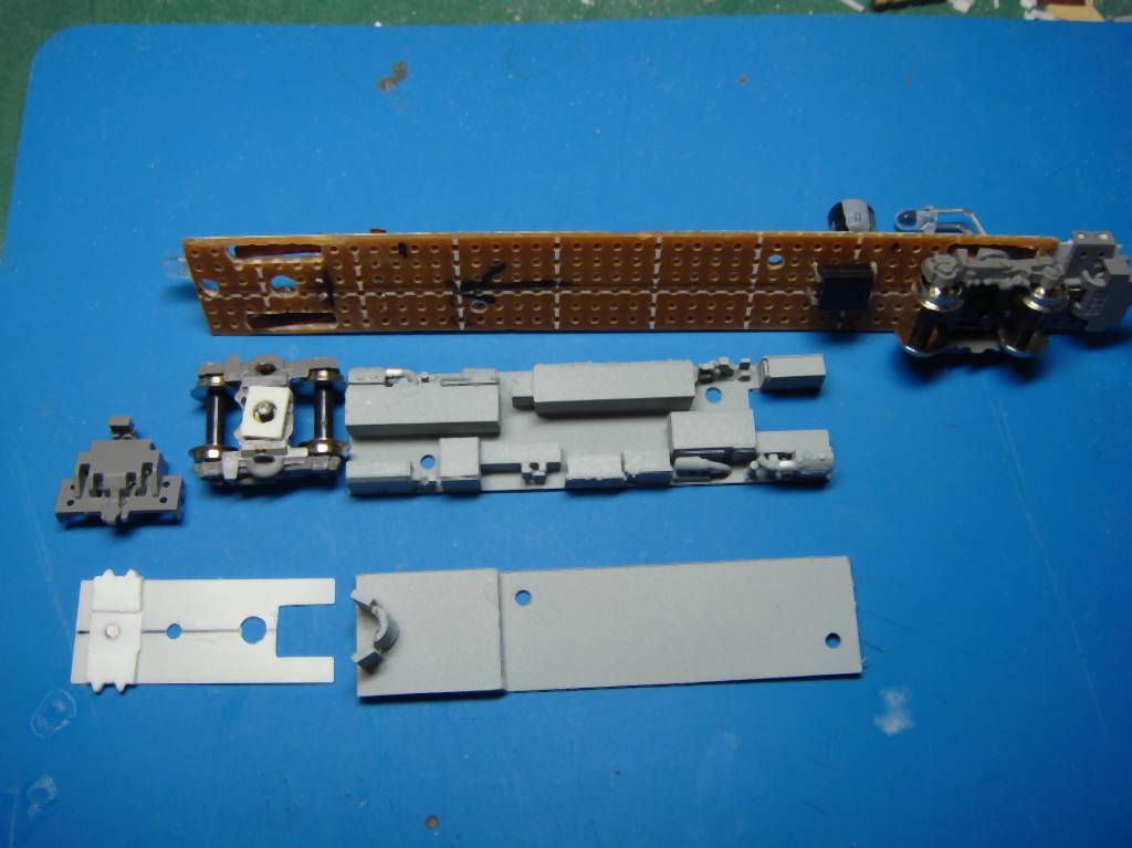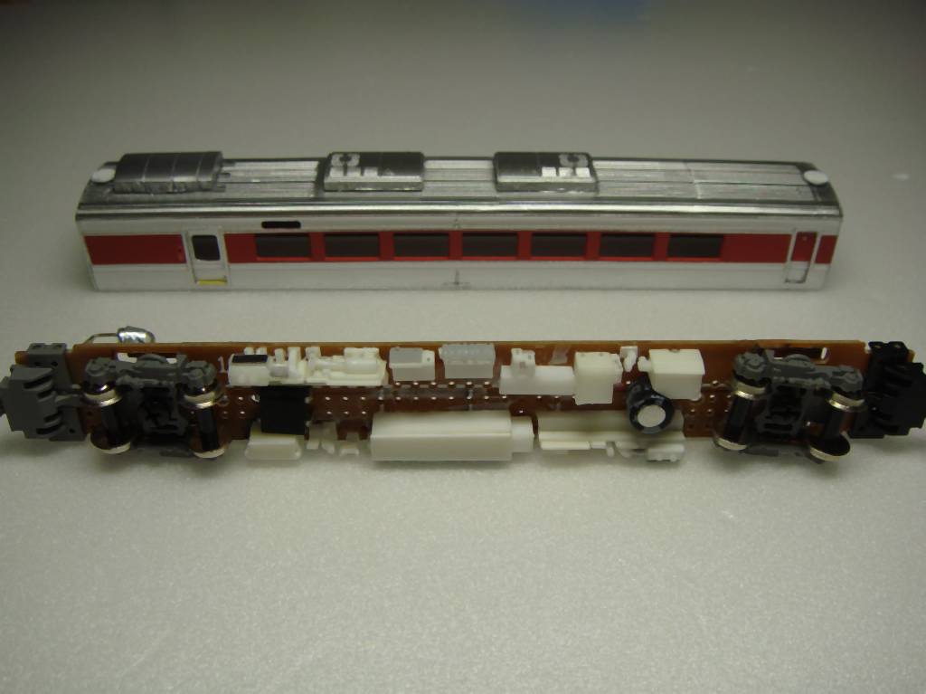 こんな感じで床下機器や室内の床板、TNカプラーアダプターのパーツで構成されます。ユニバーサル基盤は集電シューの穴あけが若干めんどくさいのと、脆いので台車周りが割れないように気をつかうのが欠点でしょうか。