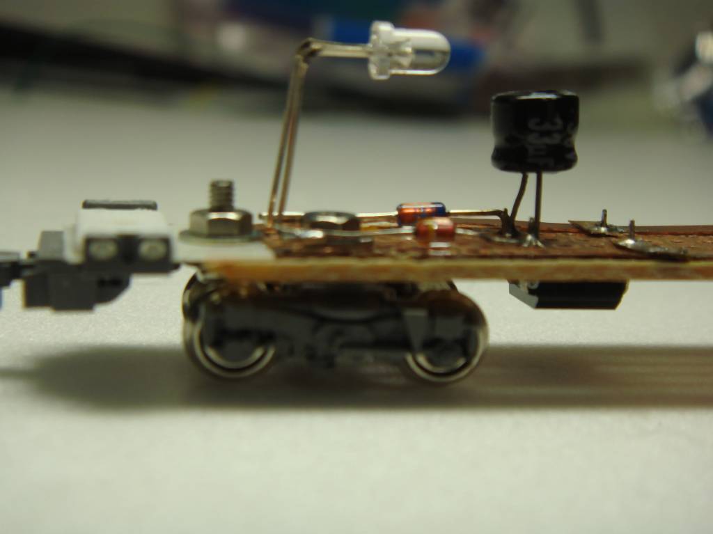 LEDとCRD、コンデンサ、ブリッジダイオードを取り付けた状態です。ブリッジはある意味本当の「床下機器」になっています。素子を床下機器箱に閉じ込められれば素敵ですね。