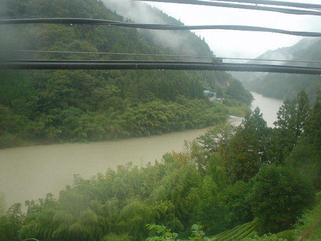 降り続いていた雨で濁流の天竜川。天気悪すぎですwwww各駅で車掌さんがダッシュでホーム走って改札やってた覚えがあります。(無人駅が多いので。。)
