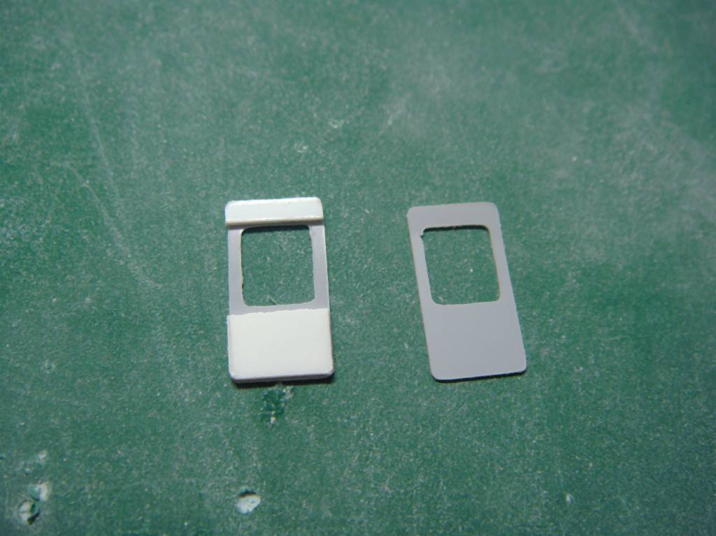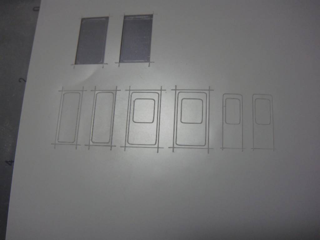 最初なのでかなりもったいない材料の切り方をしてしまいましたが、幅0.5mm細長いフレームもばっちりカットできます。ペーパーを切るための機械ですが、t0.14のプラシートは問題なく切れます。角は交差させるように図面を書いておくと抜きやすいです。