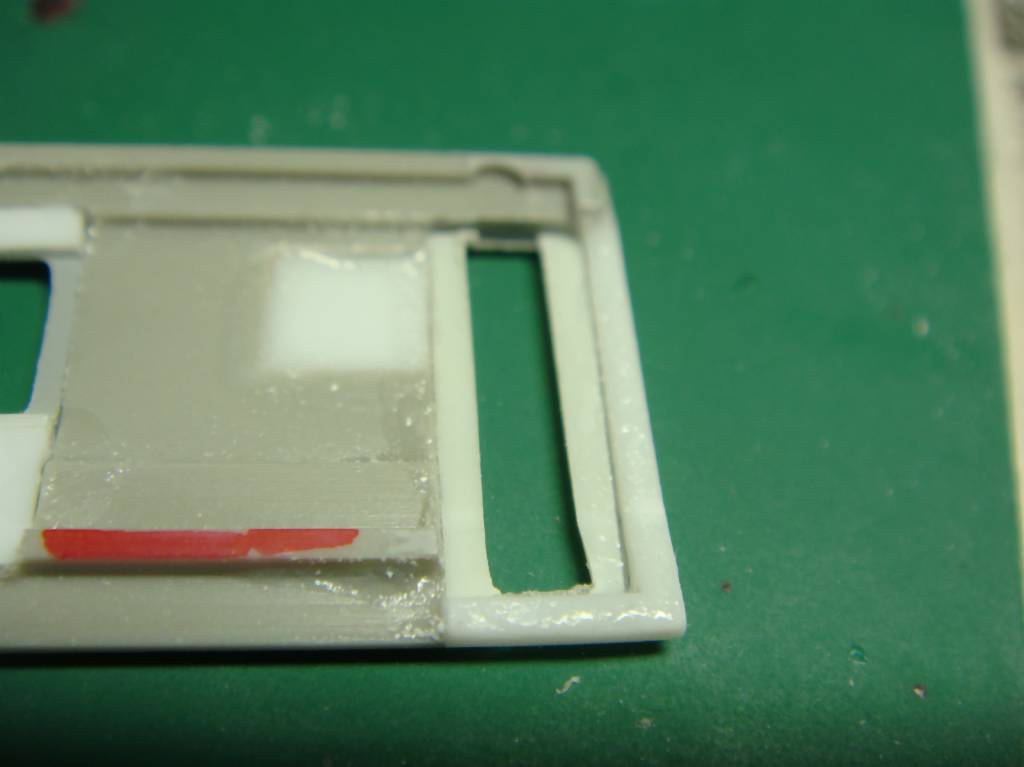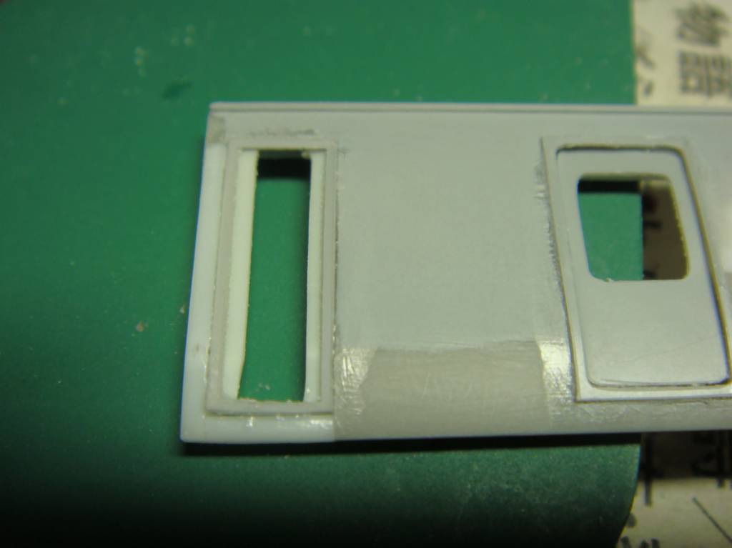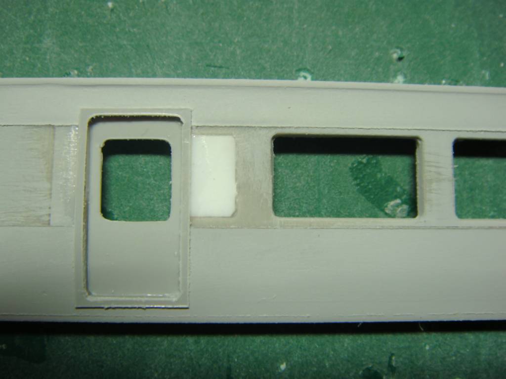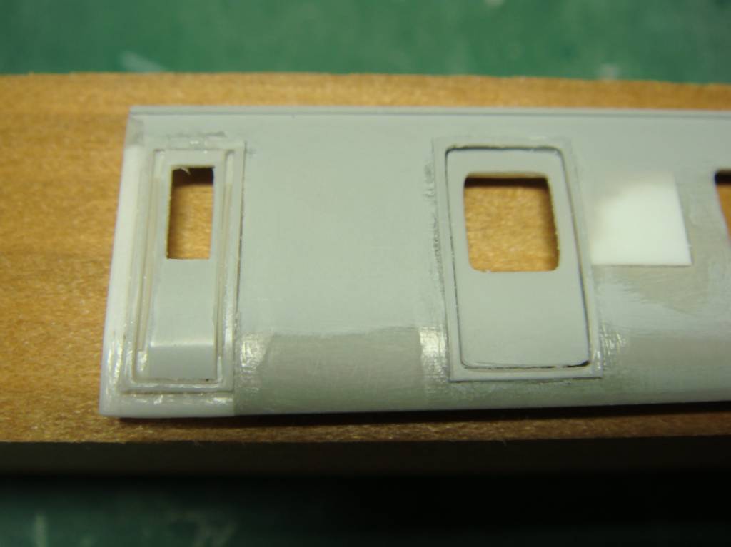 上部のサッシ?のモールドを削って、実車の窓割に近くなるように窓を埋めます。側出入口と乗務員出入口の開口を開けておきます。