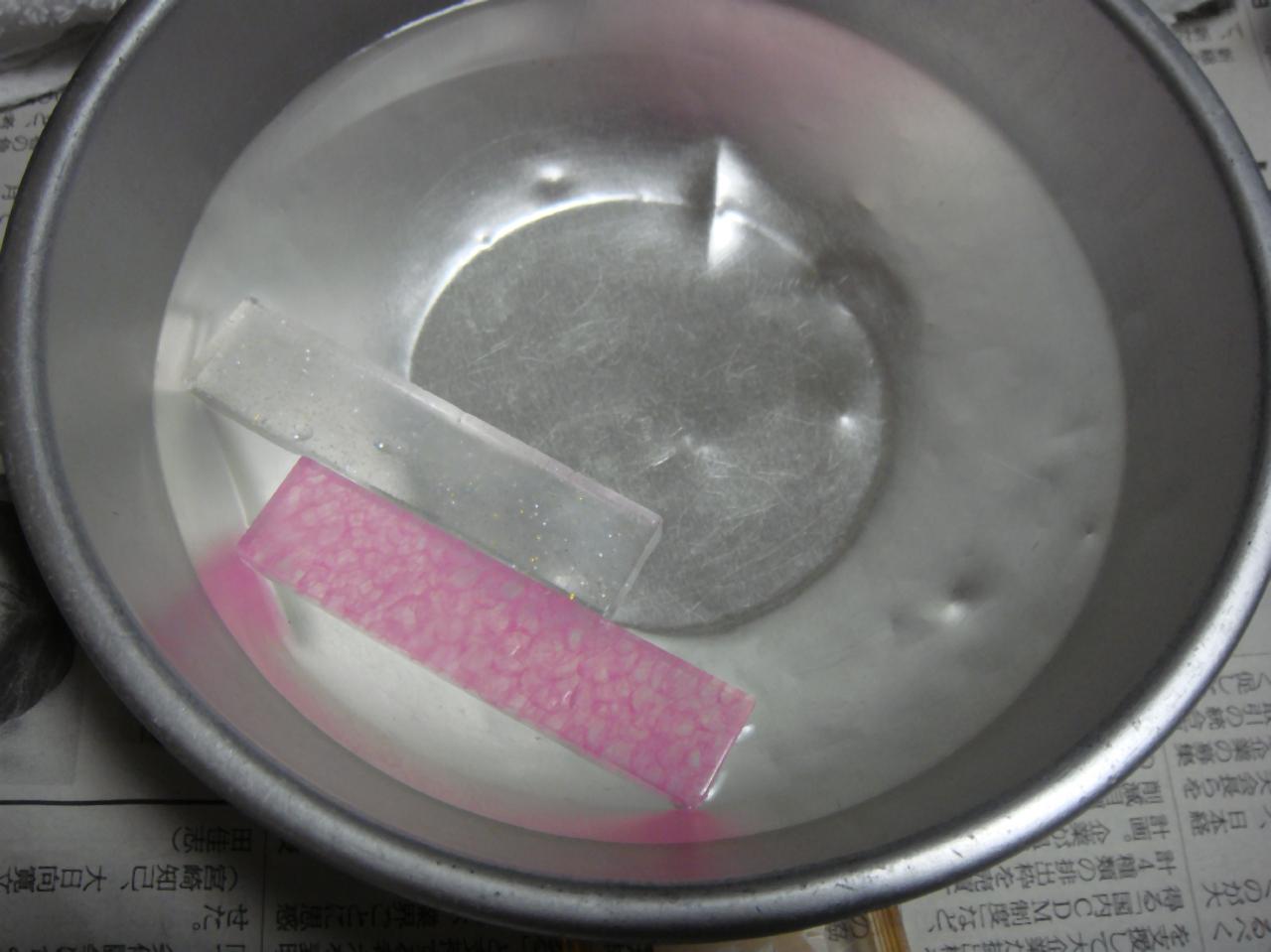 まずはその名の通りお湯であっためます。写真の色はピンクと白ですが、他に黄色と青もありました。後で注型して内部を見れる点では白(透明)のものがベストです。