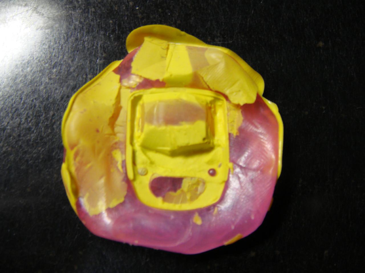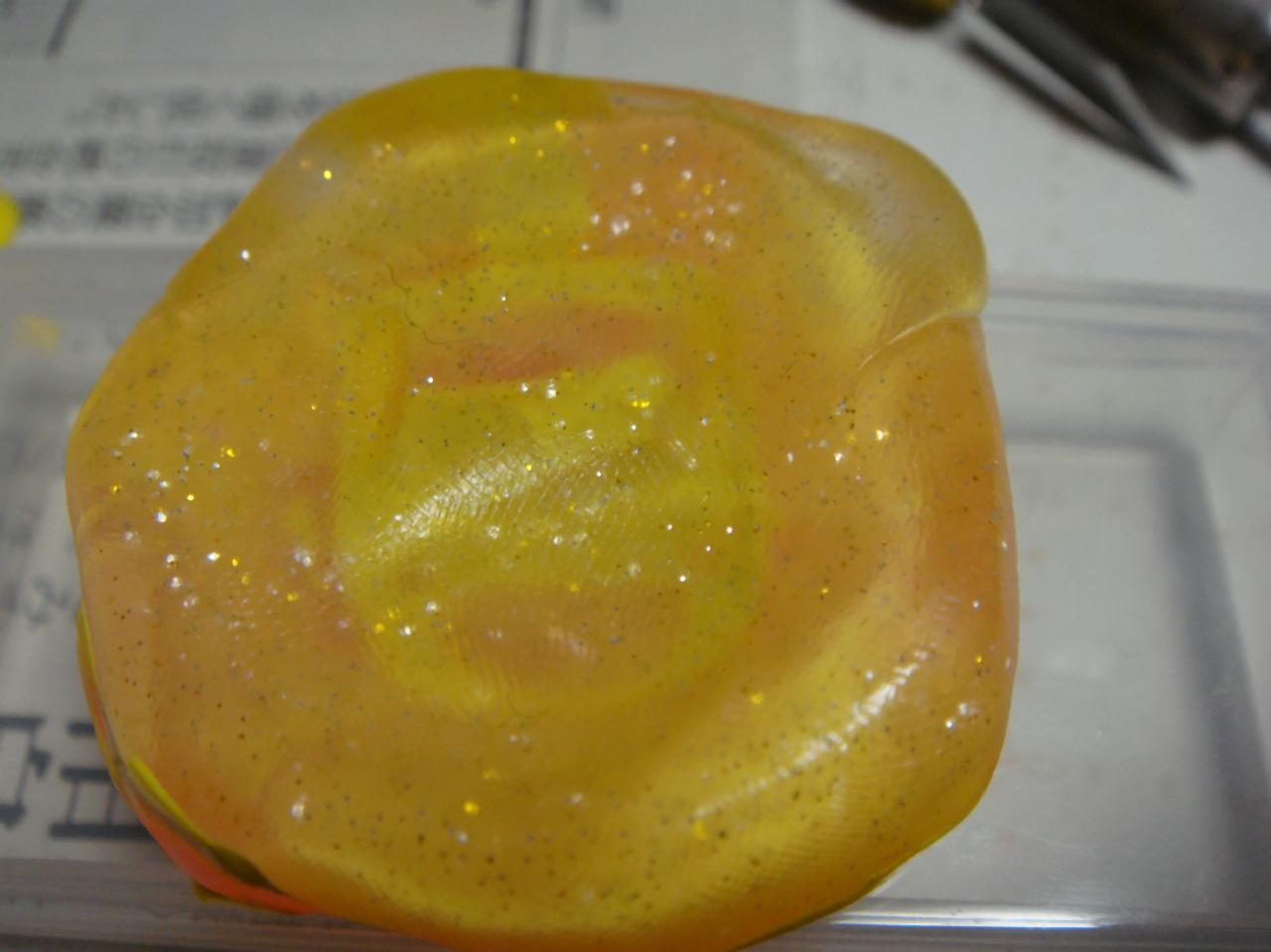 ポリパテを気泡が入らないように注入してサンドイッチします。マスタード入れすぎのハンバーガーみたいになります。型が透明なので光硬化パテでもいけますが、半生になりそうだったので今回はポリパテを使いました。固形が待ち遠しいです。