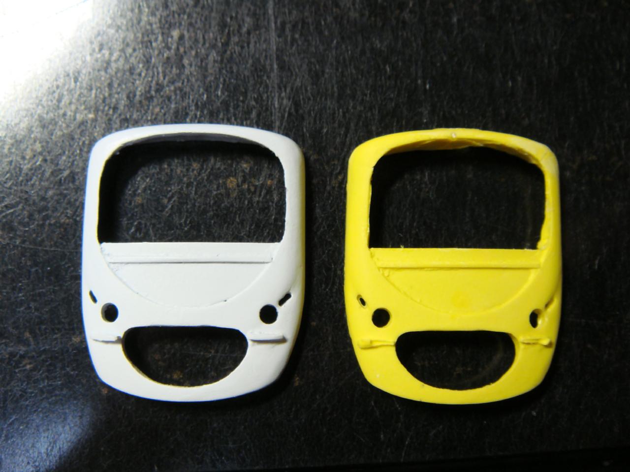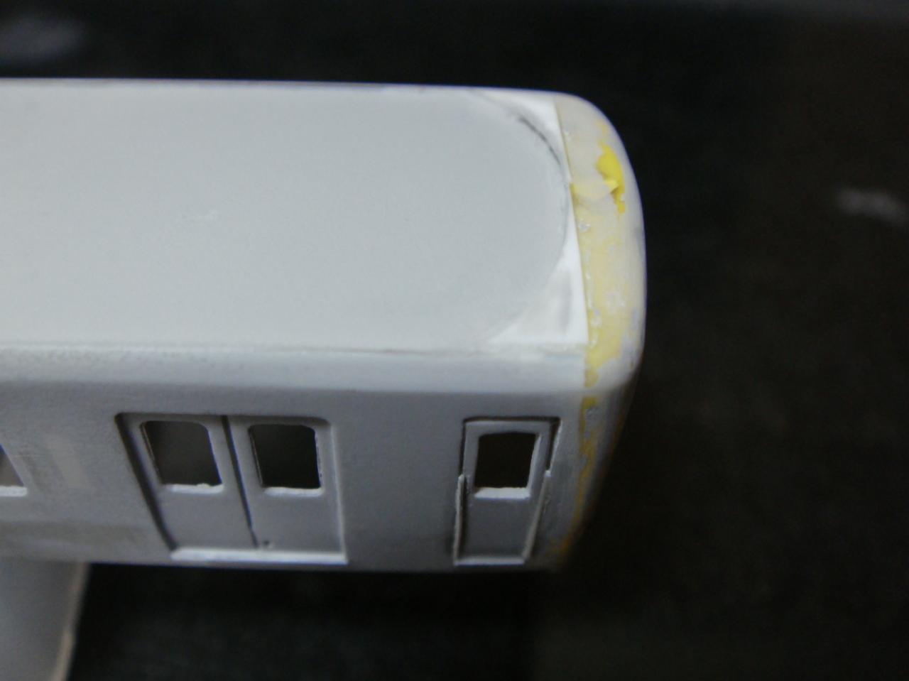 ポリパテでコピーしたマスクはそのままだと強度が無いので接合してしまいます。屋根に回り込むRの板とともに瞬間接着材でスキマを埋めながら仕上げました。オデコの表面に一層とスカートのウラから軽く全体に瞬間接着剤を塗って補強しておきました。スカートが折れやすそうだなぁ。。これで車体はBトレ0%達成です。