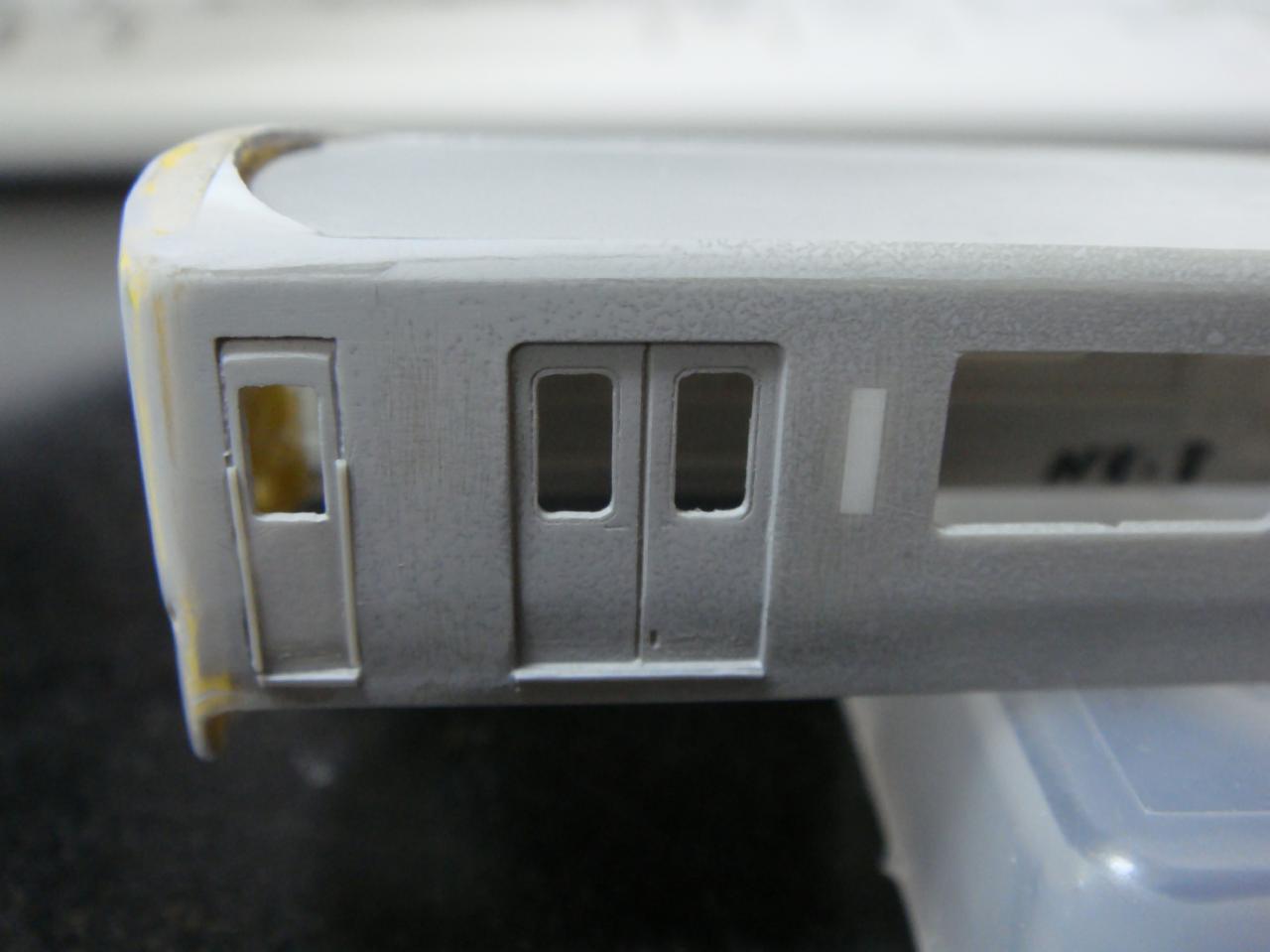いろいろ細かいところを修正しましたがすべては修正し切れませんでした。。。角のエッジがきれいに出ていたのと戸袋が若干見栄えが悪くなってしまいましたが1200のサフでごまかしました(今回はキレイに吹きました)。あとは戸先の警戒色のベースにするホワイトを薄く丁寧に塗った後、マスキングテープを細く切り出してマスキングします。