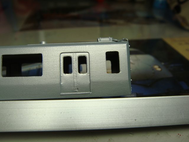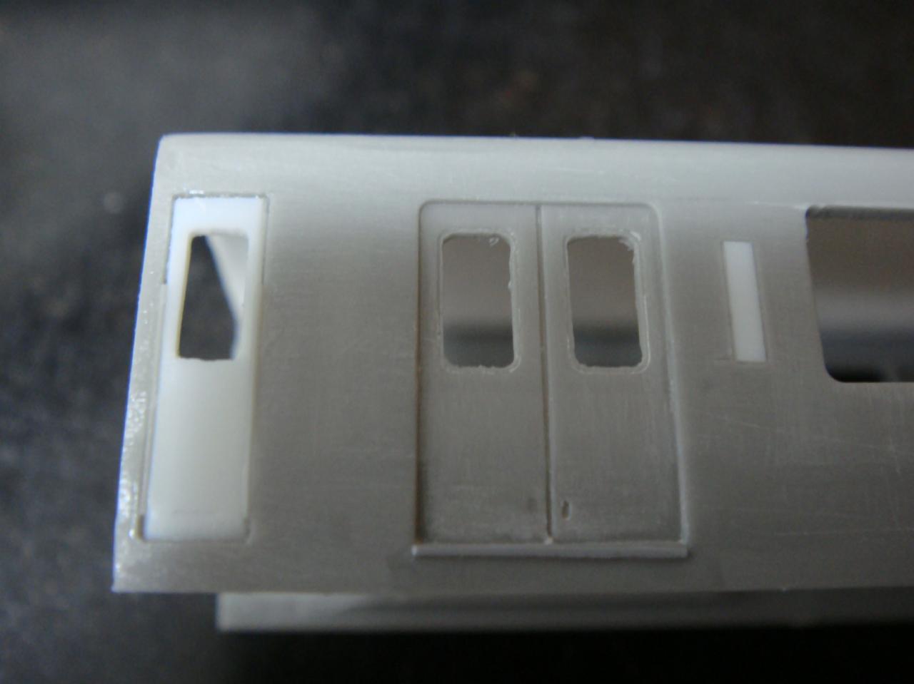 元の扉をくりぬいて左右に0.3mmずつくらい広げて角のRを取り四角く仕上げます。t0.5のプラ板を下から1mmのところで若干折り曲げた乗務員扉をはめ込み、タミヤの緑キャップで固定したあと溝が埋まらないように注意して裏から瞬間接着剤で止めます。手すりは伸ばしランナーを、削ってしまった靴ズリはt0.14プラペーパーをタミヤ緑キャップでくっつけます。