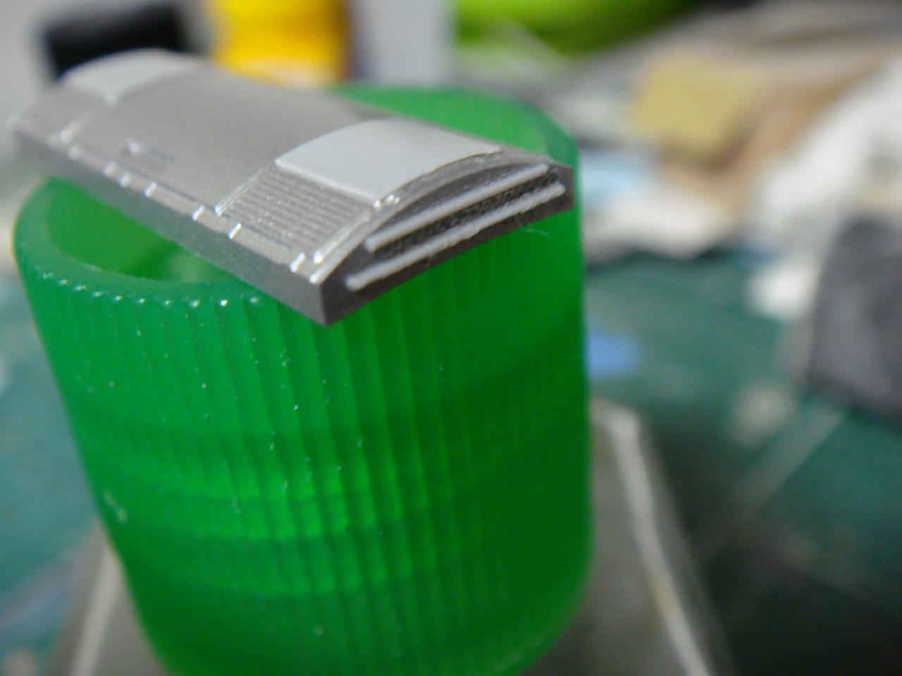 ポリパテで複製していたのもはボディに接着していましたが、分割していたものはゴム系接着剤で仮止めしたあと、ウラから丁寧に瞬間接着剤で本付けしてます。接合部は細くマスキングして黒い線を表現しました(ホントはライナーかまして段差つけるといいのですが)。