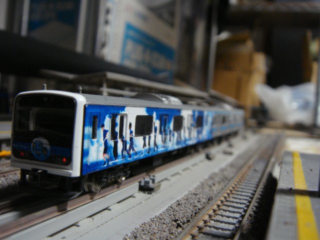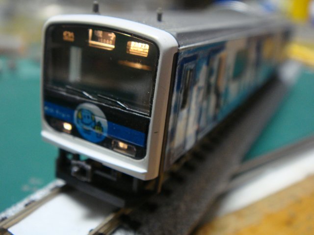 実験車両はTOMIXの209系です。若気の至りでエコトレイン仕様になっていますが、10年前くらいにデカールを貼ってクリアでコーティングしてあるものの保管がいい加減だったので部分的に劣化していました。