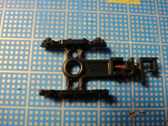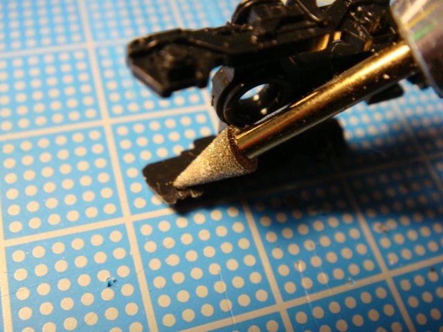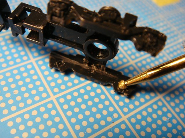 次に台車の加工です.そのままでは集電板が入らないのでリューダーでガリガリ広げます.ちなみにGMの東急TS(だけかな)は外側のモールドの車軸と内側の車軸の穴がズレててE231の台車よりも軸間が短くなってて加工がめんどくさいです.