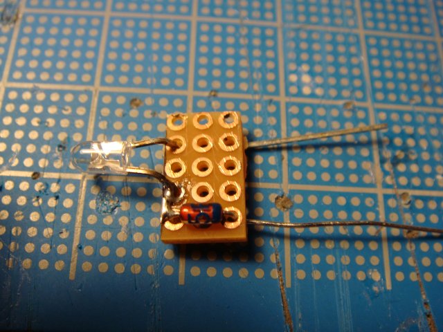 つぎはライトの本体を作ります.今回ちゃんぷろーどさんから白色LEDでHID風の8500にとのことなのでΦ2の白色LEDを使います.コンデンサーつければより安定した点灯が望めると思いますが今回は手元になかったので省略します.小さく切ったユニバーサル基盤に定電流ダイオードとハンダ付けしてすぐ完成です.