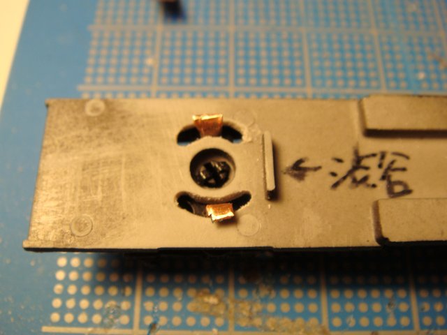 シューの長さがそのままでは短いので銅板をまきつけてハンダづけしたら,両面テープをつけて台車をはめ込みます.