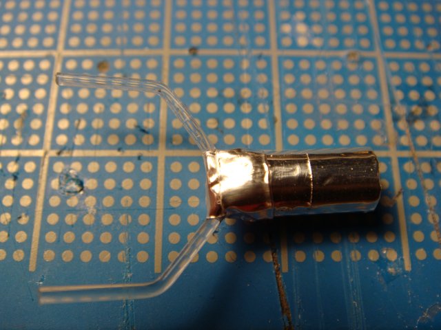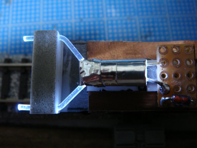 導光は光ファイバーを使います.透明パイプに遮光のアルミテープを巻きつけてクワガタみたいなのを作ります.二つのライトの間隔は,床板にプラシートで高さを調節して5mm角棒を接着して屋根を入れる前の構体と現物あわせをします.ライトは元のモールドを削って銀河のパーツをつけます.