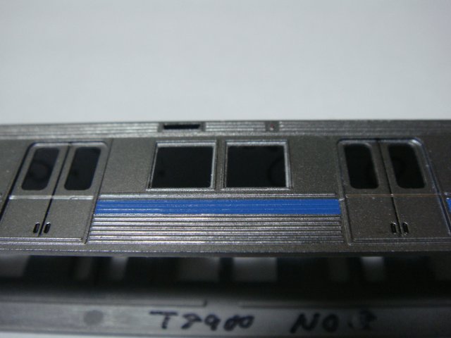 この青帯の色ですが,以前115系の広島快速色のグラデーションを塗った時にあまった水色にいろいろまぜものして作ったものを使用しました.というわけで二度と作れないので大事に塗っていかないと…