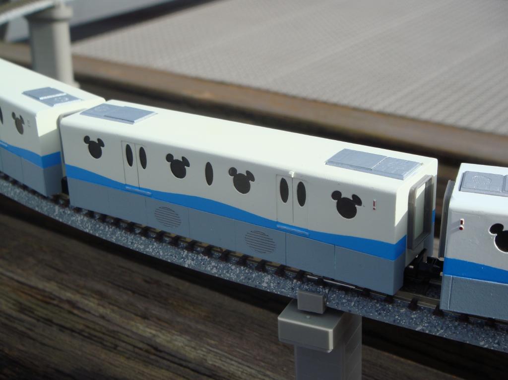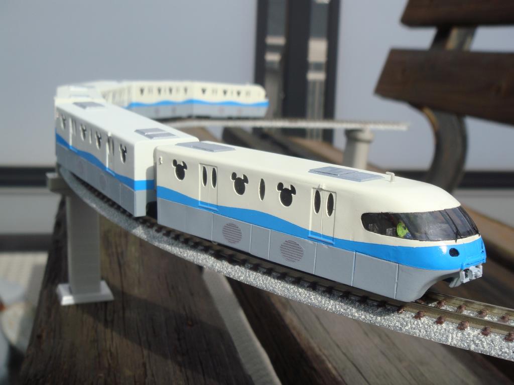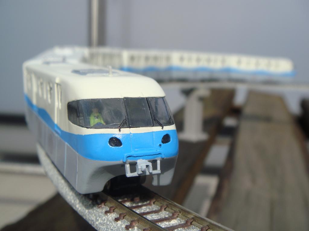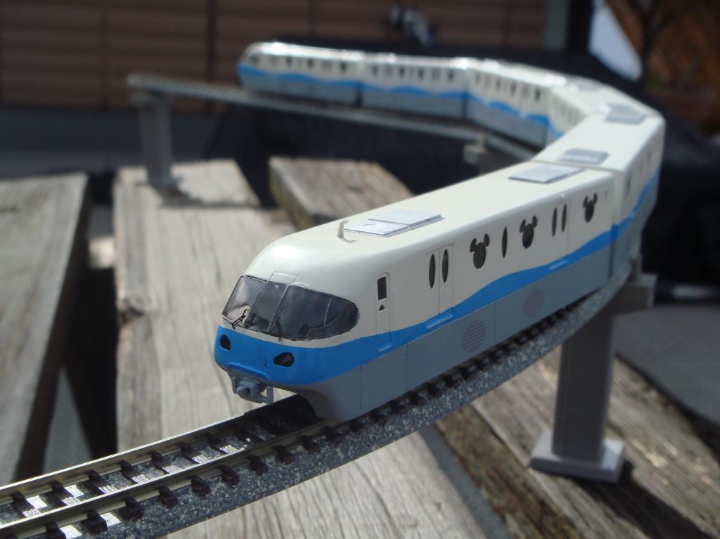 屋外でTOMIXのファイントラックを直接橋脚に固定してモノレールチックにしてみました。編成にするとレール走行でもそれっぽく見えます。中間車は室内を作りこんだ車両やオルゴールを組み込んだ車両もあります。両先頭車以外は電池とスイッチを搭載してどこでも室内灯が点灯できるようになっています…がこれが後にあだとなることに。。