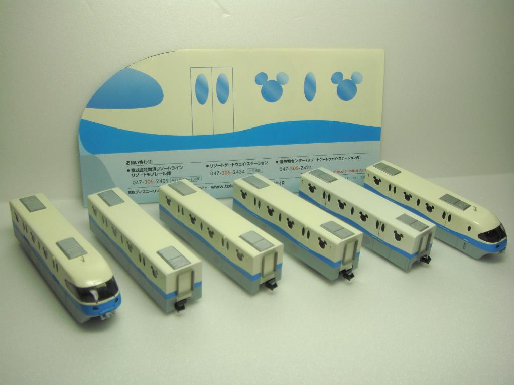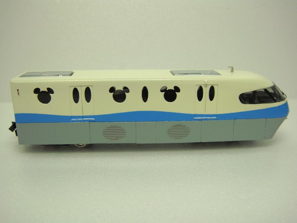 中間車です。この車両は先行して試作したので他の車両と白の色合いが微妙に異なってしまっていますがそれもご愛嬌。。。戸あたりゴムやスカートの色さしもしていますが量産車は省略しています。室内にはディスプレイコーナやシート、手すりつり革なども作りこみましたが、残念ながら一部のみで量産には至っておりません(大変なので。。。)。室内灯は電池を搭載しているので床下のスイッチでどこでも点灯できますが、車両の重量が増してしまい、上記の鉄コレ動力のみでは勾配を上れない結果になってしまいました。