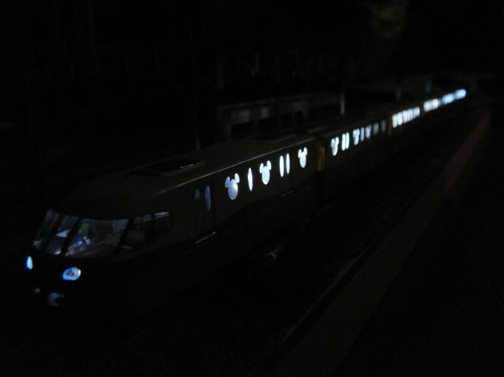 ヘッド・テールライトが点灯します。実物は環状片方向運転なので切り替えは省略しています。